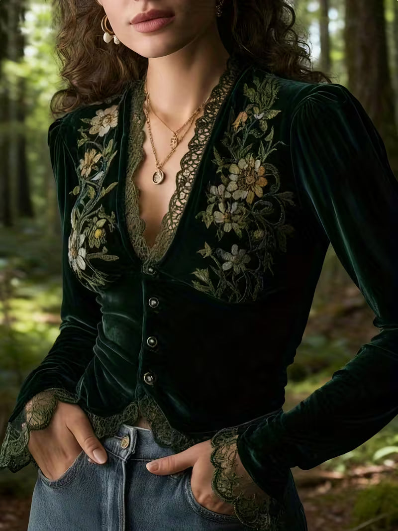Sophisticated and effortlessly polished, this long-sleeve velvet top combines luxurious texture with delicate floral embroidery for timeless appeal. The flowing silhouette drapes naturally over the body, offering flattering movement and refined balance. Designed for versatility, it pairs beautifully with trousers, skirts, or jeans, making it an elevated yet effortless choice for everyday wear or special occasions.